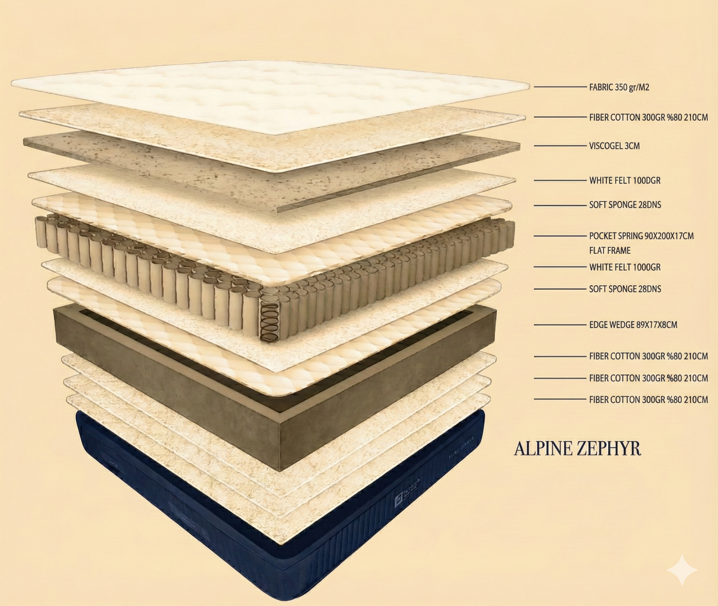 Die Alpine Zephyr fängt die belebende Essenz alpiner Winde ein, mit einem vom Wind inspirierten Muster und kräftigen blauen Kanten. Lagen aus VISCOGEL und WHITE FELT, die für Weichheit und kühle Ruhe in Kombination mit der festungsartigen Stütztechnologie EDGE WEGDE sorgen, damit Sie tiefer schlafen und erfrischt aufwachen.